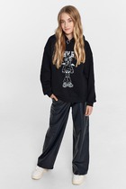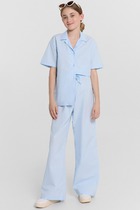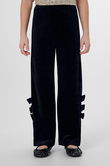 Брюки для девочек, с высокой посадкой, прямого силуэта. Пояс цельнокроеный с эластичной тесьмой внутри 30RV. Боковые швы с разрезами. Внизу, на боковом шве штанины расположено три бантика. Низ в подгибку