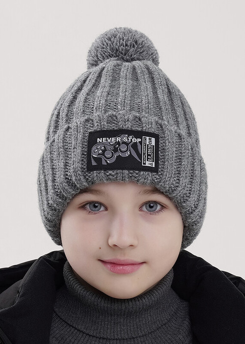 Детская шапка с отворотом и ниточным помпоном. Декорирован стильной нашивкой, утепление флисом по всей голове.Отлично подойдёт для холодной зимы.