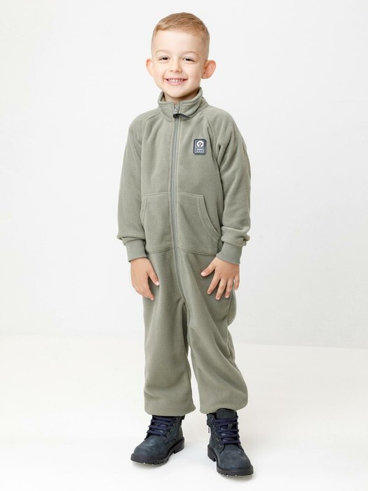 Флисовый комбинезон для мальчика с высоким воротником. Застёгивается на удлинённую молнию с мягкой защитой шеи и подбородка. Рукава и низ изделия на манжетах из  трикотажа в рубчик. Эластичная резинка по спинке обеспечивает идеальную посадку. Спереди удобный карман-кенгуру. Комбинезон сохраняет цвет и форму после многократных стирок.
