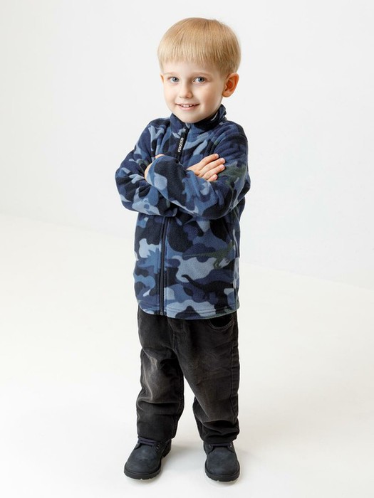 Флисовая куртка для мальчика. У изделия высокий воротник и застёжка на молнию с мягкой защитой шеи и подбородка. По бокам два кармана. Оригинальная набивка выполнена из стойких гипоаллергенных текстильных красителей. Куртка сохраняет цвет и форму после многократных стирок.