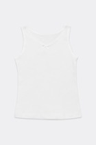 Топ для девочек из рибаны, облегающего силуэта, длиной ниже уровня талии. Перед и спинка цельнокроеные. Горловина круглая. Горловина и проймы окантованы широкой бейкой из основного полотна. Низ изделия обработан швом в подгибку.