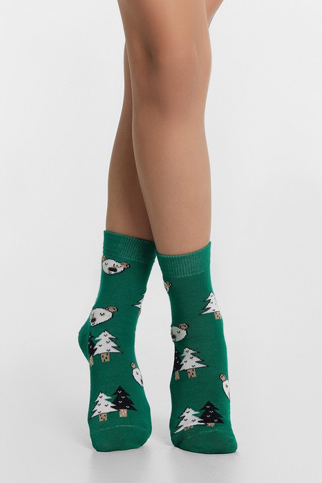 рис.2136 Детский носок с плюшевым следом и рисунком в виде елок и медведей.