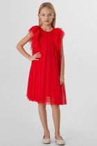 Платье свободного силуэта. Перед и спинка цельнокроеные. Горловина круглой формы c окантовкой из трикотажного полотна рибаны. В горловину втачан вязаный воротник, шов втачивания закрыт х/б тесьмой. Рукава длинные, втачные. Линия плеча спущена. По низу рукавов притачные манжеты из трикотажного полотна рибаны. Низ изделия фигурный, обработан на 2-х игольной плоскошовной машине швом в подгибку. Длина платья выше колена.