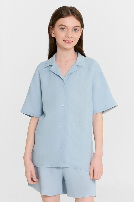 Блузка для девочек. свободного силуэта из ткани. По переду обработана застежка на пуговицы d=10mm и петли. Рукава короткие, втачные, слегка спущены. Нижние срезы изделия и рукавов обработаны швом в подгибку.