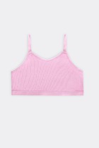 Топ для девочек прилегающего силуэта. Горловина круглая. Проймы и горловина окантованы бейкой из основного полотна. Низ изделия обработан швом в подгибку.