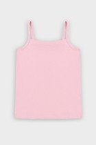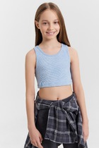 Топ для девочек прилегающего силуэта. Горловина круглая. Проймы и горловина окантованы бейкой из основного полотна. Низ изделия обработан швом в подгибку.