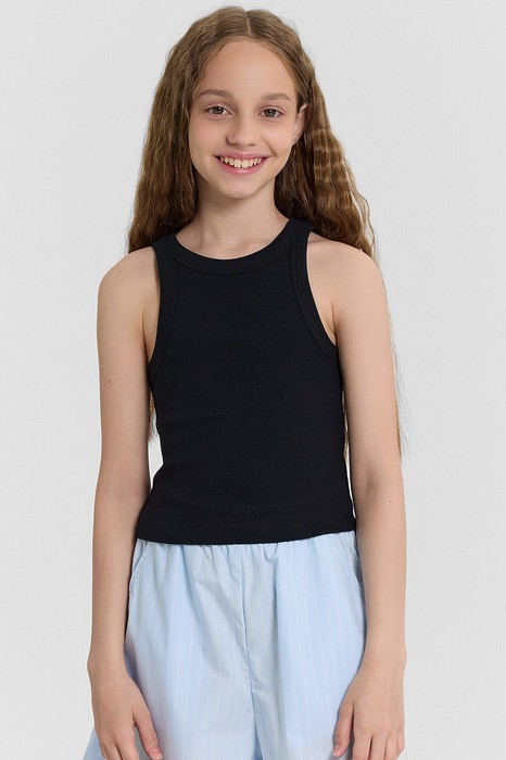 Топ для девочек из рибаны, облегающего силуэта, длиной ниже уровня талии. Перед и спинка цельнокроеные. Горловина круглая. Горловина и проймы окантованы широкой бейкой из основного полотна. Низ изделия обработан швом вподгибку.