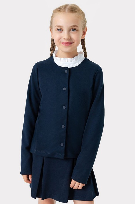 Жакет полуприлегающего силуэта с баской и застежкой на кнопки. Горловина круглой формы. Рукава длинные, втачные. Низ рукавов и изделия обработаны на 2-х игольной плоскошовной машине швом в подгибку.