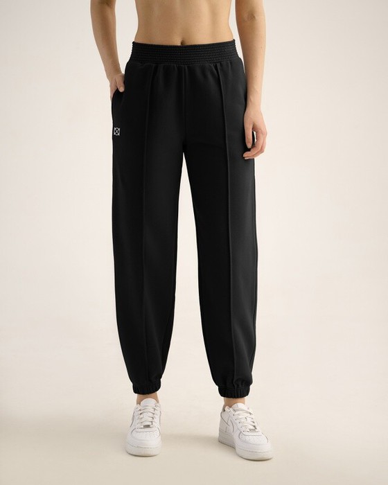 Свободные брюки BLOOMERS по передним деталям с застроченной стрелкой, высокая талия, карманы в шве, зауженные к низу,низ на резинке. Пояс из основной ткани,отстрочен