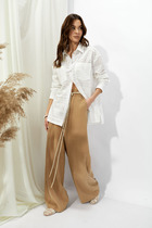 Блузка из вискозного трикотажного полотна, свободного кроя. Длинный втачной рукав,внизу манжет с пуговицей. Отложной воротник, спереди цельнокроеная планка с застежкой на пуговицы, нашивка. На спинке кокетка. По талии съёмный пояс. Фигурный низ изделия.