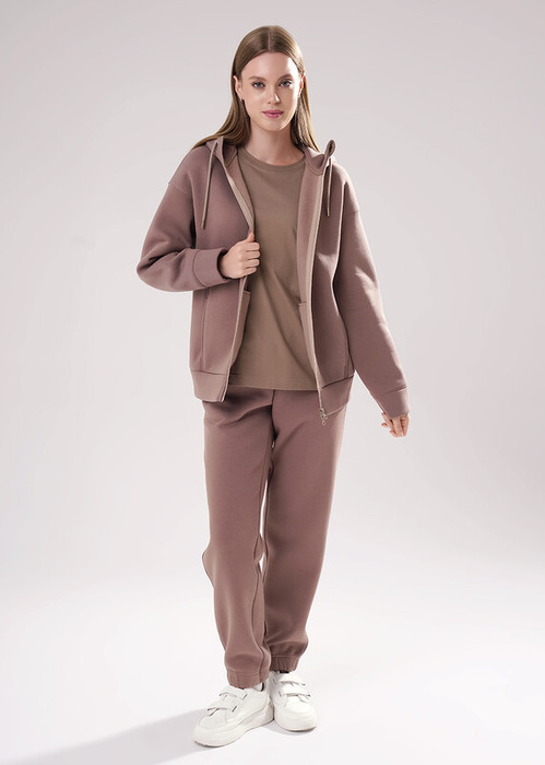 Брюки спортивные из трикотажного полотна футер с начесом,зауженные книзу. По талии пояс на резинке и внутренним шнуром. По низу брюк подгибка с внутренней резинкой. Боковые карманы с отрезным бочком.
