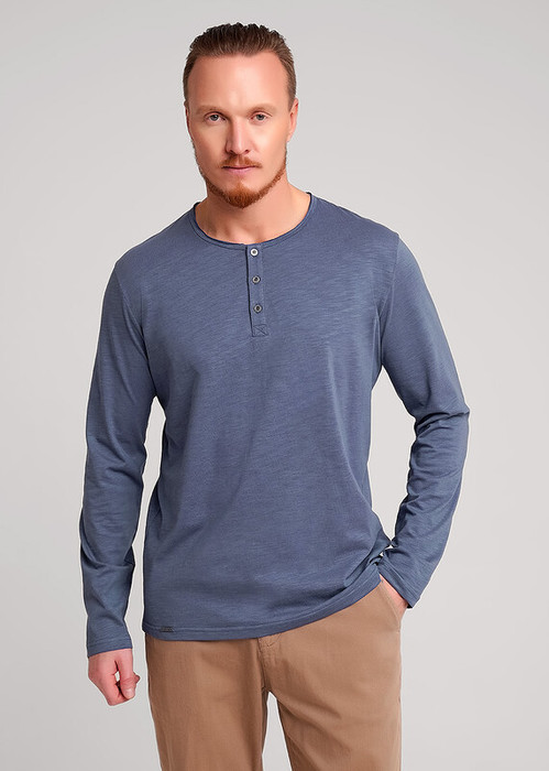 Лонгслив мужской с длинным рукавом, округлой необработанной горловиной на планке из фактурного полотна флам. Изделие дополнено имиджевой фурнитурой. Данная модель прекрасно комбинируется с джинсами или шортами благодаря своей универсальности.