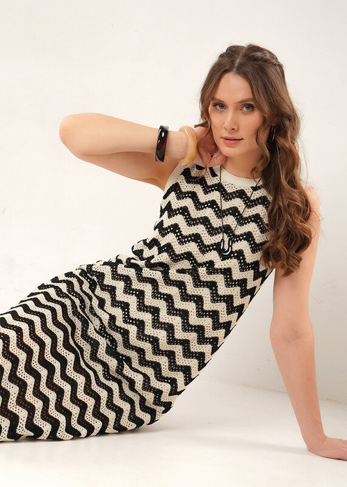 Платье из текстильного полотна на подкладе. Округлая горловина с вязаными обтачками. Боковые разрезы.