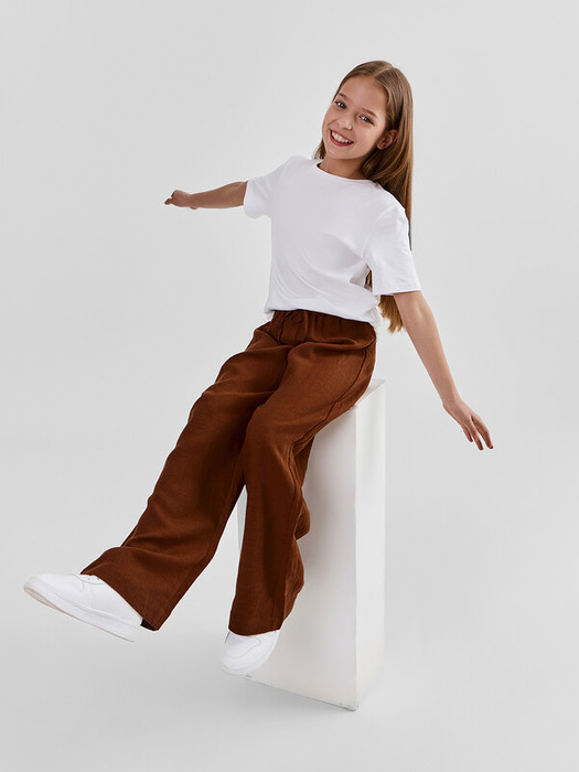 Брюки для девочек прямиго силуэта. Средняя посадка, пояс отрезной с эластичной тесьмой внутри 20RV. В поясе пробиты петли и втянут шнур из основного полотна.  Низ обработан швом в подгибку.