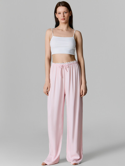 Брюки прямые свободные, посадка средня. Пояс цельнокроеный с эластичной тесьмой внутри (внутр. 20RV). С внешней стороны пояса пробиты петли и вставлен шнур-бейка из основного полотна. По верхнему срезу отделка из кружева 2.4см (L156-2.4, арт. JS00017-2.4). Брюки с боковыми швами. Нижние срезы обработаны швом вподгибку с закрытым срезом.