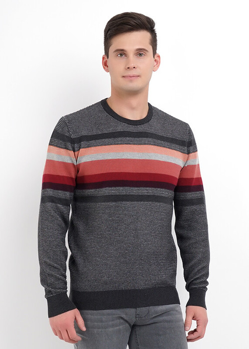 Мужской вязаный джемпер с круглым вырезом горловиины и длинным рукавом-незаменимая вещь в гардеробе модника. Модель уникальна провязанными цветными контрастными полосами в области груди. Сочетание с джинсами и кедами сделает образ более повседеневным.