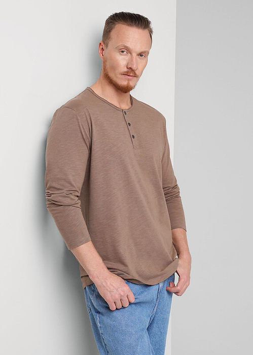 Лонгслив мужской с длинным рукавом, округлой необработанной горловиной на планке из фактурного полотна флам. Изделие дополнено имиджевой фурнитурой. Данная модель прекрасно комбинируется с джинсами или шортами благодаря своей универсальности.