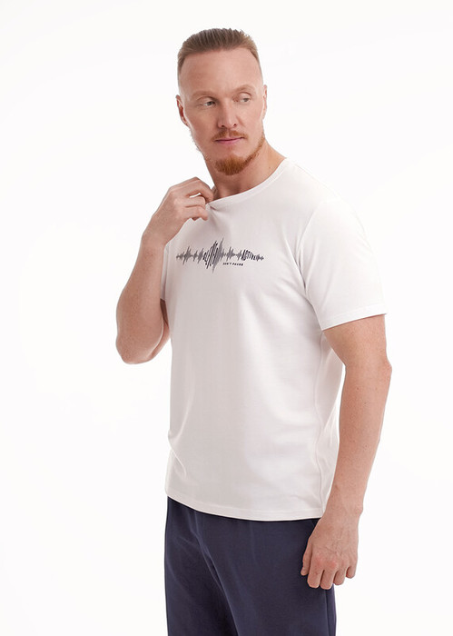 Футболка из трикотажного полотна с коротким рукавом и круглой горловиной. Дополнена имиджевым принтом. Отличный вариант для встреч с друзьями и прогулок.