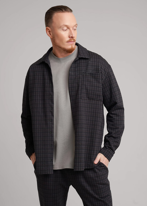 Мужская куртка-рубашка выполнена из трикотажного полотна футер, свободного силуэта с отложным воротником и застежкой на пуговицы. Модель дополнена нагрудным карманом. По низу рукава манжета. Отлично подойдет для повседневного гардероба.