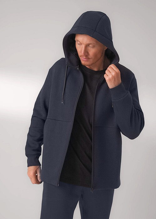 Тёплая мужская трикотажная куртка на молнии с капюшоном и вместительными карманами. Произведена из мягкого трикотажного футер с начёсом, дополнена дизайнерским принтом. Удобный и практичный вариант на каждый день.