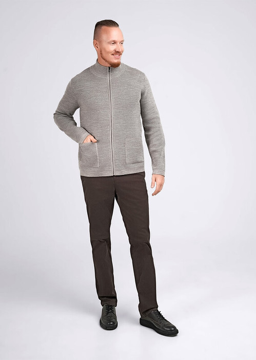 Вязаный жакет с воротником стойка и застежкой на молнию, дополнен накладными карманами. Жакет выполнен из смесовой пряжи, хорошо согревает и неприхотлив в уходе. Изделие будет приятно в носке в прохладную погоду с джинсами или брюками.