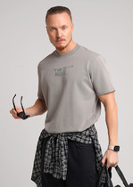 Фуфайка с коротким рукавом среднего объема, круглым вырезом горловины, которая оформлена обтачкой из рибаны.