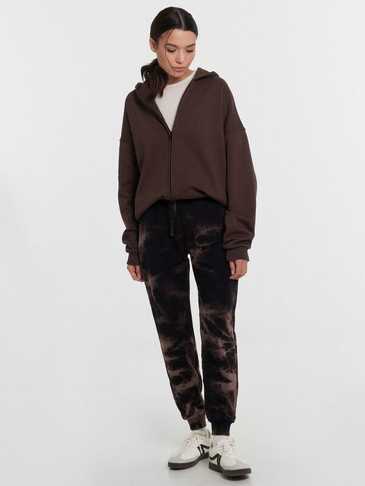 Брюки изготовлены из трикотажного полотна футер. Брюки прямые с высокой посадкой. Пояс отрезной из рибаны с эластичной тесьмой внутри. В передней части пояса с лицевой стороны пробиты петли и втянут шнур. Шов втачивания пояса распошит. Спереди обработаны карманы хулиганы. По низу брюк отрезные манжеты из рибаны.