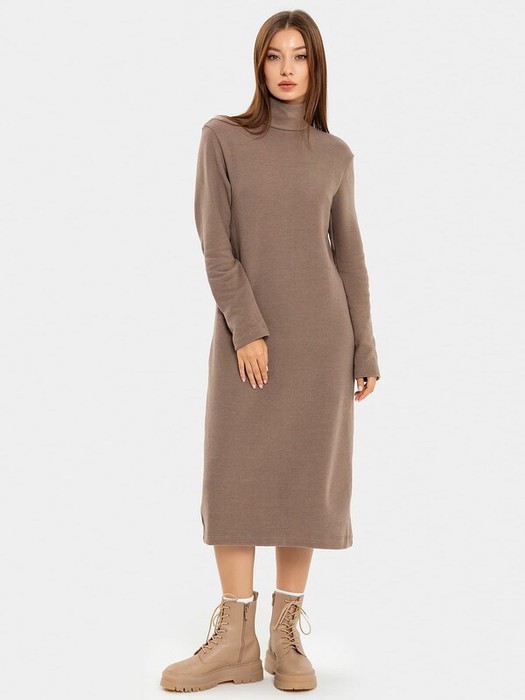 Платье прямого силуэта из трикотажного полотна селаник. Горловина круглой формы с воротником-стойкой. На детали спинки центральная застежка на потайную молнию и обработан разрез. На детали переда вытачки от бокового шва. Рукав втачной длинный.