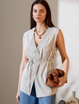 22.03 Vilatte Удлиненный костюмный жилет в полоску с поясом из легкого хлопково