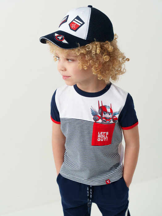 Детская бейсболка для мальчика. Передняя часть выполнена из плотной хлопковой ткани, боковые и задние части — из дышащей сетки. Козырёк изогнутый. Слева спереди — нашивка, рядом — декоративный элемент с самолётом. На козырьке размещён шеврон. Сзади — регулировка на липучке.