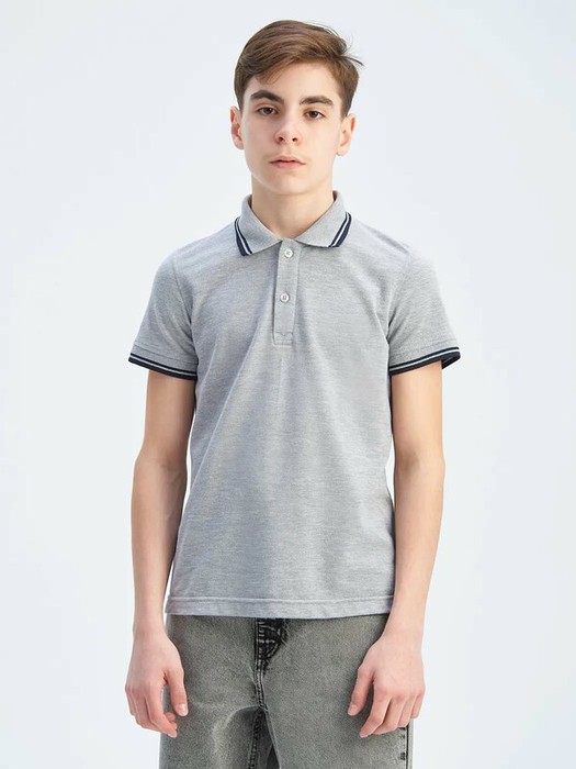 Поло из 100% хлопка с короткими рукавами, отложным воротником рубашечного типа, с центральной укороченной застежкой по переду на пуговицы. По краю воротника и на манжете рукава расположена контрастного цвета полоса.