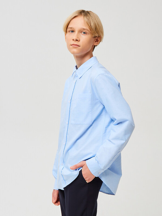 Сорочка для мальчика из смесового хлопка полуприлегающего силуэта. На спинке - кокетка. Воротник отложной со стойкой. Левая сторона полочки дополнена накладным карманом. Застёжка по центру переда на планку с кнопками. Рукава рубашечные со шлицами и манжетами.