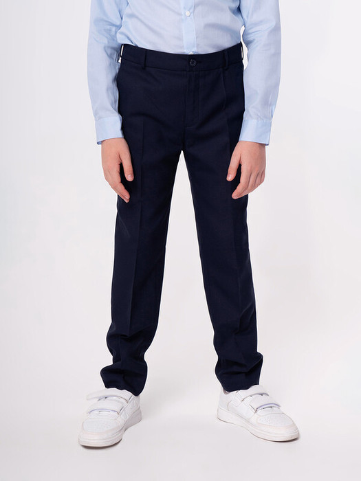 Классические брюки для мальчика из износостойкой и устойчивой к смятию костюмной поливискозы немного зауженные к низу. На передней части брюк боковые карманы, заглаженные стрелки и застёжка - гульфик на молнии. На правой задней половинке брюк - карман с клапаном, на втачном поясе с регулировкой и шлёвками. Отличный вариант на каждый день.