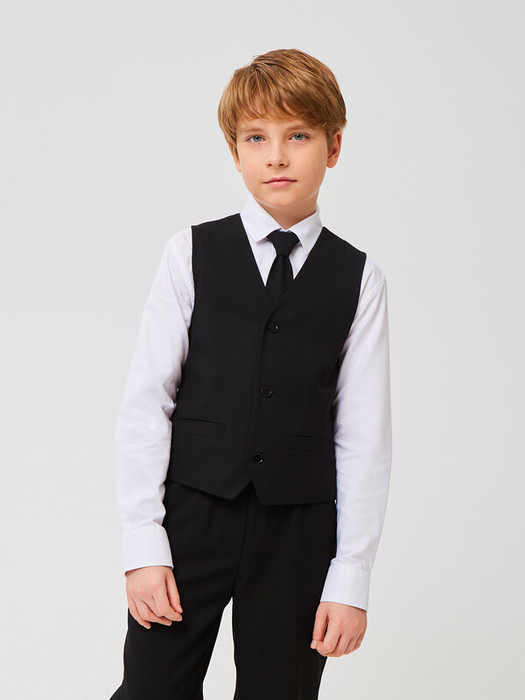 Жилет из смесовой вискозы на вискозной подкладке для мальчика с V-образным вырезом и боковыми прорезными карманами с листочкой . Спинка дополнена хлястиком с металлической пряжкой для регулировки жилета по полноте. Застегивается на три пуговицы.
