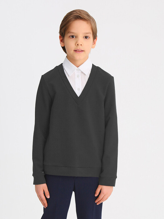 Джемпер трикотажный для мальчика прилегающего силуэта с имитацией манишки из сорочечной ткани контрастного цвета. Воротник отложной со стойкой. Укороченная застёжка на переде на планку с пуговицами. Рукава втачные длинные, на манжете. По низу изделия притачной пояс. Отличный вариант на каждый день.