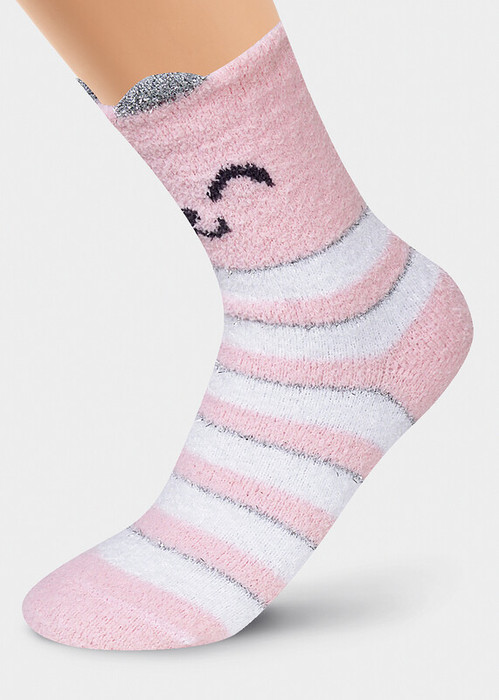 мягкие уютные носки из ""травки"" в полоску с люрексом, с мордочкой кошки и ушками 3Д