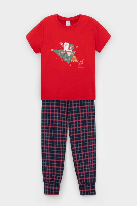 Трикотажная пижама из натурального хлопка. Однотонная футболка с короткими рукавами. Спереди принт. Штаны с набивным рисунком. Эластичные манжеты, цельнокроеный пояс, внутри плоская резинка. Оригинальные принт и набивка выполнены из стойких, гипоаллергенных текстильных красителей. Изделие сохраняет цвет и форму после многократных стирок. Все трикотажные полотна производятся в соответсвии с нормами Швейцарского сертификата ЭкоТекс.