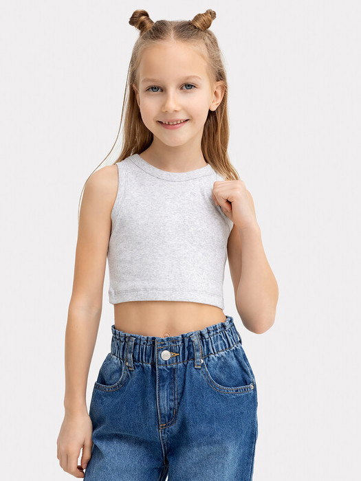Топ для девочек прилегающего силуэта. Горловина круглая. Проймы и горловина окантованы бейкой из основного полотна. Низ изделия обработан швом в подгибку.