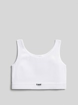 Хлопковое бюстье прилегающего силуэта для девочек. Выполнено из легкой и приятной к телу трикотажной рибаны. Вырез горловины и проймы окантованы эластичной тесьмой. На бретелях есть кольца-регуляторы. По нижнему краю бюстье расположена удобная и стильная жаккардовая тесьма. Идеально!