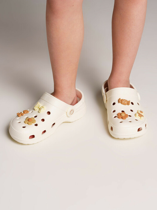 Сабо из облегченного и прочного ЭВА. Материал хорошо моется. Модель украшена милыми джибицами. Форма модели учитывает эргономику стопы. Модель имеет перекидной ремешок для лучшей фиксации обуви на ноге.