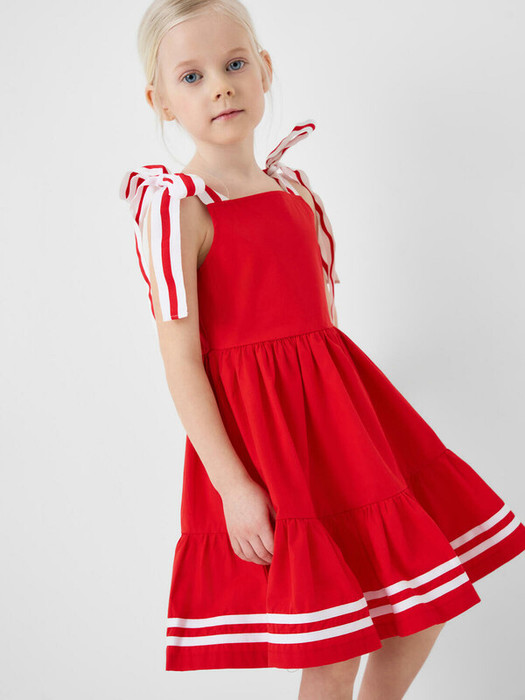 Детский сарафан для девочки. Выполнен из легкой хлопковой ткани поплин. Модель свободного кроя со сборкой на талии и широкими лямками, которые завязываются на плечах. На спинке — эластичная вставка, позволяющая изделию хорошо садиться по фигуре без застежек. Длина чуть выше колена.