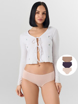 Трусы-бикини женские из эластичного хлопкового полотна. Обработка краев по талии - ажурная резинка с фестоном, по ноге - узкая окантовка. По переду и спинке кружево. По переду бант.