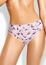 Бикини с кружевной вставкой по верху переда и кружевной спинкой со средним швом. По поясу и ножке со стороны переда обработка резинкой с фестоном. На детали переда - небольшой атласный бант.