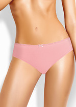 Бикини из однотонного хлопкового полотна. На детали переда расположены симметричные вставки из сетки, декор кружевом. По ножкам и поясу обработаны резинкой с фестоном. Спереди по центру - небольшой бант.