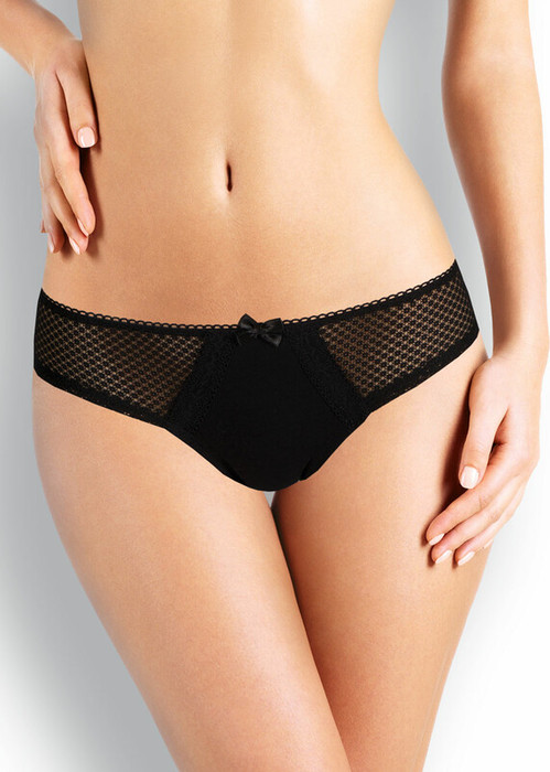 Бразилиано. Комбинированная модель: перед - однотонное хлопковое полотно, спинка и отрезной бочок - кружево. По талии - резинка с фестоном. В центре на детали переда расположен небольшой атласный бант. Декорированы симметричными элементами из кружевной тесьмы,расположенными по линии реза