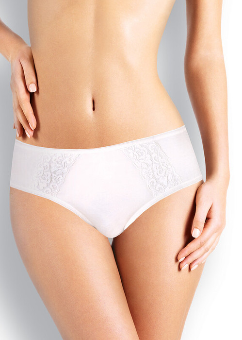 Классическая модель, декорированная симметричной кружевной тесьмой на передней части изделия. По ножкам и талии обработаны резинкой с атласным кантом.