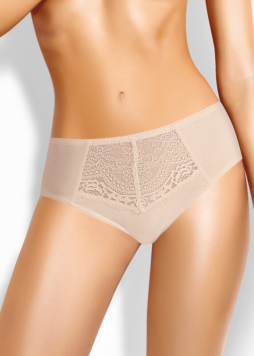 Трусы-слипы женские из эластичного хлопкового полотна. По переду резы и вставки из кружева. Обработка краев - ажурная резинка с фестоном.