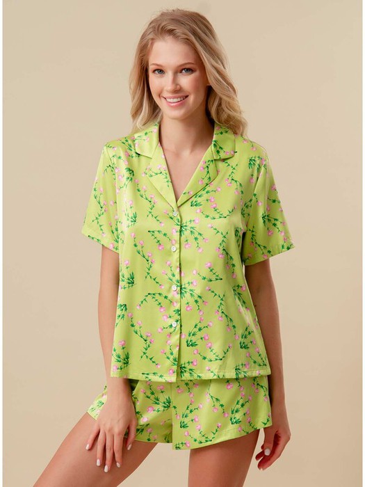 Пижама Indefini салатового цвета украшена нежным цветочным принтом, добавляя пижаме свежести и женственности.