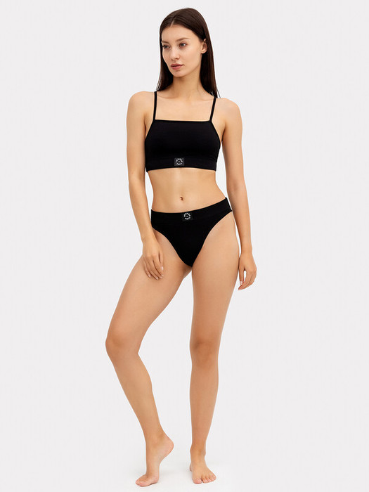 Бюстье женское из кулирной глади. Перед и спинка цельные. Перед на подкладке из кулирной глади. Срезы горловины переда, проймы и верхний срез спинки окантованы бейкой из основного полотна. Окантовка проймы переда переходит в бретель. На продолжении бретели из полотна стоит бретелечная тесьма с регулировкой по длине. Кольца-регуляторы.