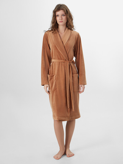 Бархатистый велюр с добавлением эластана мягко облегает фигуру, сохраняя тепло и даря невероятные тактильные ощущения. В этом халате так приятно пить утренний кофе, читать книгу вечером или встречать близких — вы всегда будете выглядеть собранной и элегантной даже в моменты отдыха.